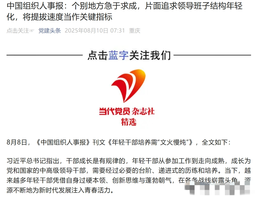 原来,近日,《中国组织人事报》刊文,批评“个别地方急于求成,片面追求领导班子结构年轻化,将提拔速度当作关键指标。”