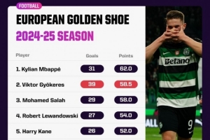 本赛季欧洲金靴积分: